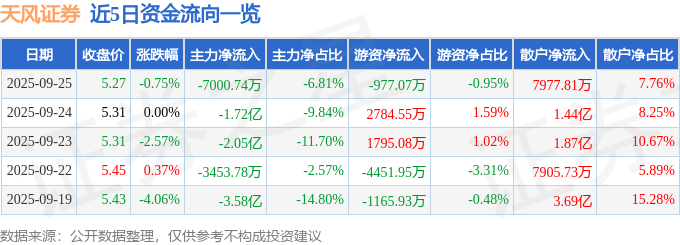 证券之星消息,截至2025年9月25日收盘,天风证券(601162)报收于5.27元,下跌0.75%,换手率2.24%,成交量193.87万手,成交额10.28亿元。