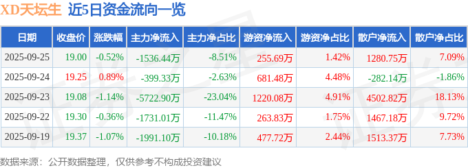 证券之星消息,截至2025年9月25日收盘,XD天坛生(600161)报收于19.0元,下跌0.52%,换手率0.48%,成交量9.48万手,成交额1.81亿元。