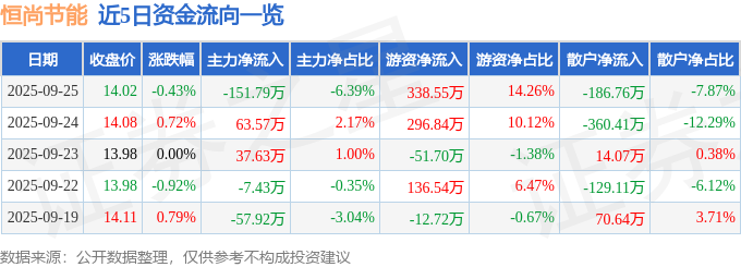 证券之星消息,截至2025年9月25日收盘,恒尚节能(603137)报收于14.02元,下跌0.43%,换手率2.29%,成交量1.69万手,成交额2374.23万元。