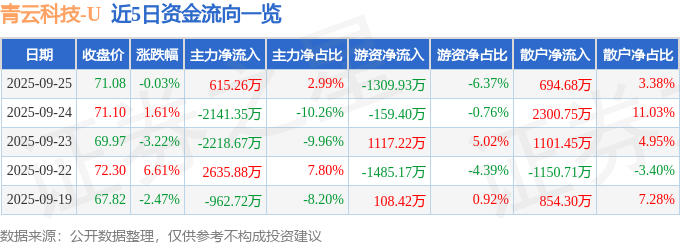 证券之星消息,截至2025年9月25日收盘,青云科技(688316)报收于71.08元,下跌0.03%,换手率5.97%,成交量2.86万手,成交额2.06亿元。