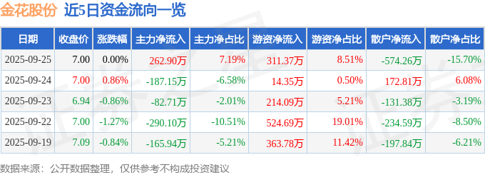 9月25日的资金流向数据方面,主力资金净流入262.9万元,占总成交额7.19%,游资资金净流入311.37万元,占总成交额8.51%,散户资金净流出574.26万元,占总成交额15.7%。