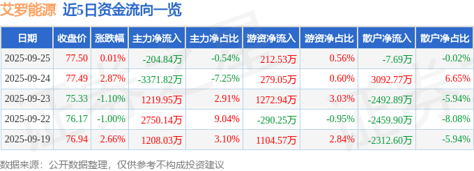 证券之星消息,截至2025年9月25日收盘,艾罗能源(688717)报收于77.5元,上涨0.01%,换手率4.99%,成交量4.85万手,成交额3.79亿元。