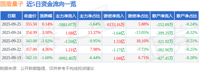 证券之星消息,截至2025年9月25日收盘,国盾量子(688027)报收于355.5元,上涨0.14%,换手率3.62%,成交量2.91万手,成交额10.43亿元。