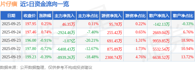 证券之星消息,截至2025年9月25日收盘,片仔癀(600436)报收于197.95元,上涨0.25%,换手率0.36%,成交量2.2万手,成交额4.34亿元。