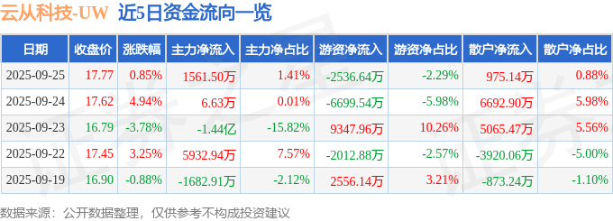 证券之星消息,截至2025年9月25日收盘,云从科技(688327)报收于17.77元,上涨0.85%,换手率7.42%,成交量61.82万手,成交额11.07亿元。