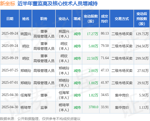 新坐标近半年内的董监高及核心技术人员增减持详情如下: