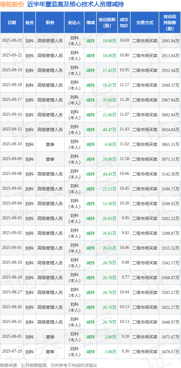 骆驼股份近半年内的董监高及核心技术人员增减持详情如下: