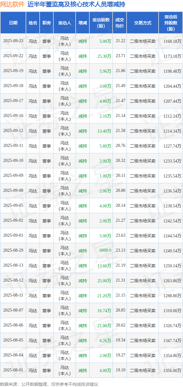 网达软件近半年内的董监高及核心技术人员增减持详情如下: