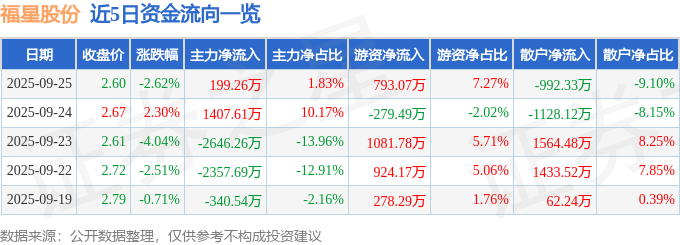 证券之星消息,截至2025年9月25日收盘,福星股份(000926)报收于2.6元,下跌2.62%,换手率2.64%,成交量41.51万手,成交额1.09亿元。