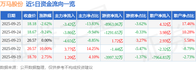 证券之星消息,截至2025年9月25日收盘,万马股份(002276)报收于18.18元,下跌2.62%,换手率13.3%,成交量133.95万手,成交额24.73亿元。