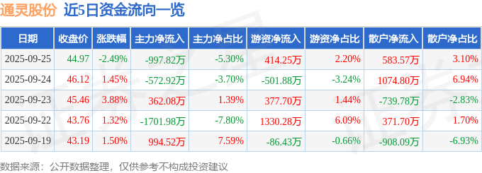 证券之星消息,截至2025年9月25日收盘,通灵股份(301168)报收于44.97元,下跌2.49%,换手率4.33%,成交量4.12万手,成交额1.88亿元。