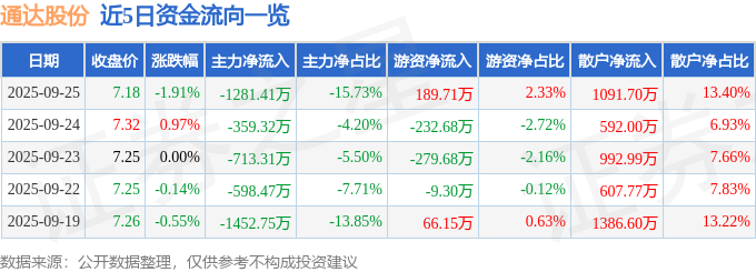 证券之星消息,截至2025年9月25日收盘,通达股份(002560)报收于7.18元,下跌1.91%,换手率2.49%,成交量11.26万手,成交额8144.24万元。