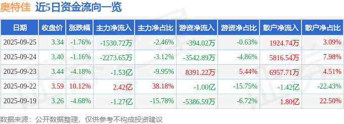证券之星消息,截至2025年9月25日收盘,奥特佳(002239)报收于3.34元,下跌1.76%,换手率5.68%,成交量184.07万手,成交额6.22亿元。