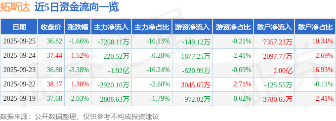 证券之星消息,截至2025年9月25日收盘,拓斯达(300607)报收于36.82元,下跌1.66%,换手率5.77%,成交量19.16万手,成交额7.12亿元。