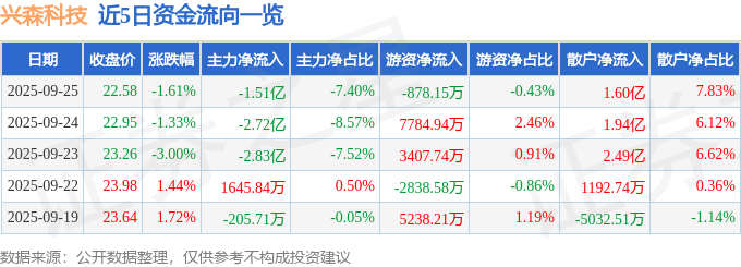 9月25日的资金流向数据方面,主力资金净流出1.51亿元,占总成交额7.4%,游资资金净流出878.15万元,占总成交额0.43%,散户资金净流入1.6亿元,占总成交额7.83%。