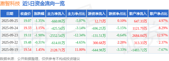 证券之星消息,截至2025年9月25日收盘,激智科技(300566)报收于19.07元,下跌1.35%,换手率2.97%,成交量6.77万手,成交额1.3亿元。