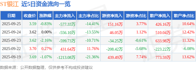 证券之星消息,截至2025年9月25日收盘,ST银江(300020)报收于3.59元,下跌0.83%,换手率1.45%,成交量11.13万手,成交额4005.18万元。