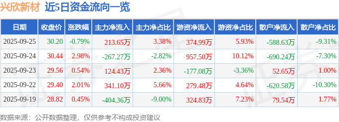 证券之星消息,截至2025年9月25日收盘,兴欣新材(001358)报收于30.2元,下跌0.79%,换手率4.11%,成交量2.1万手,成交额6321.52万元。