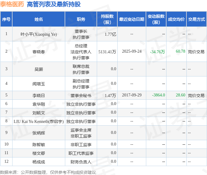 泰格医药的高管列表及最新持股情况如下: