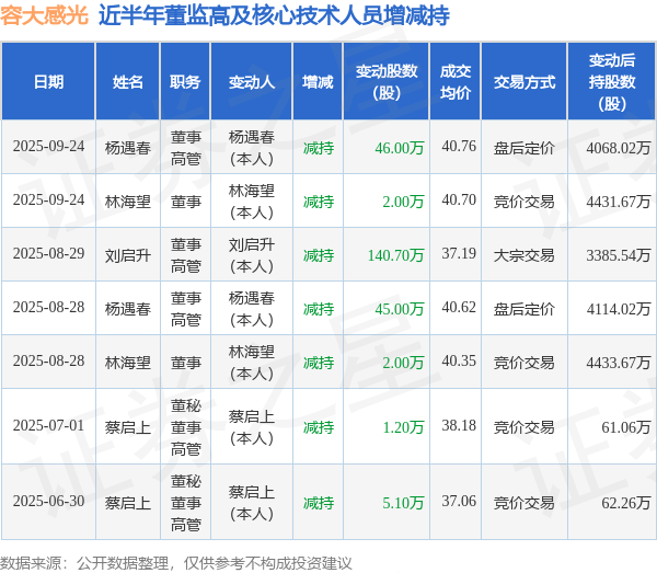 容大感光近半年内的董监高及核心技术人员增减持详情如下: