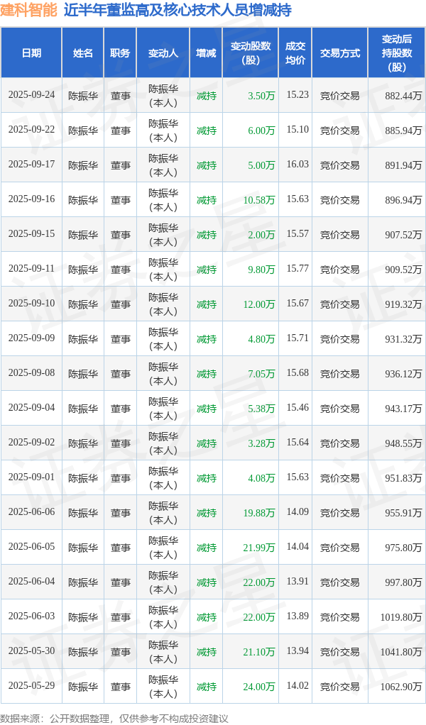建科智能近半年内的董监高及核心技术人员增减持详情如下: