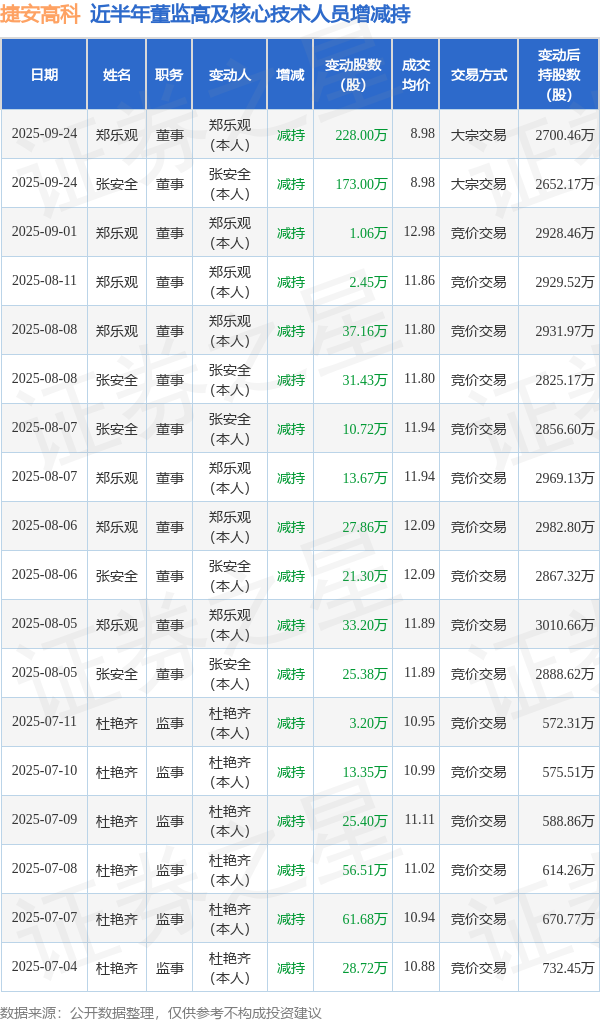 捷安高科近半年内的董监高及核心技术人员增减持详情如下: