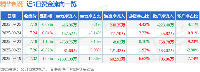 证券之星消息,截至2025年9月25日收盘,精华制药(002349)报收于7.19元,下跌0.69%,换手率0.93%,成交量7.54万手,成交额5432.43万元。