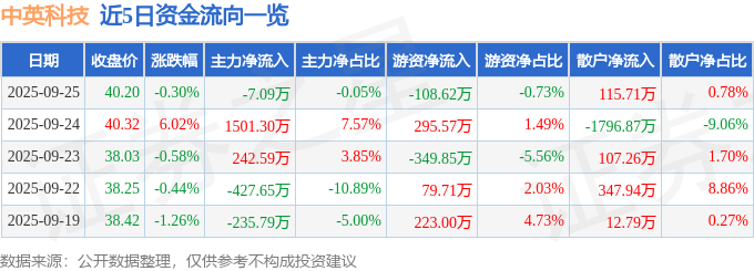证券之星消息,截至2025年9月25日收盘,中英科技(300936)报收于40.2元,下跌0.3%,换手率7.85%,成交量3.73万手,成交额1.49亿元。