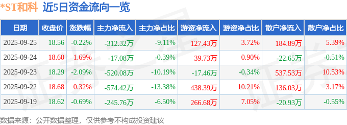 证券之星消息,截至2025年9月25日收盘,*ST和科(002816)报收于18.56元,下跌0.22%,换手率1.82%,成交量1.82万手,成交额3427.47万元。