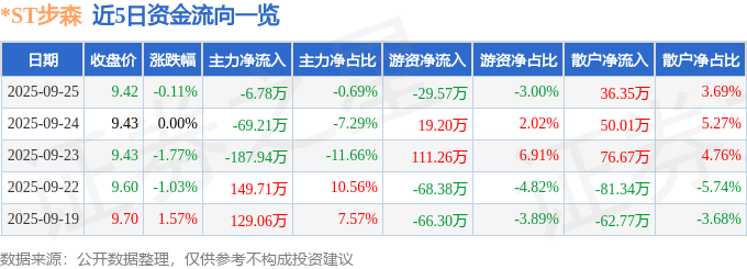 证券之星消息,截至2025年9月25日收盘,*ST步森(002569)报收于9.42元,下跌0.11%,换手率0.75%,成交量1.04万手,成交额985.41万元。