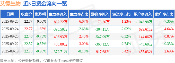 证券之星消息,截至2025年9月25日收盘,艾德生物(300685)报收于22.77元,上涨0.0%,换手率1.61%,成交量6.26万手,成交额1.43亿元。