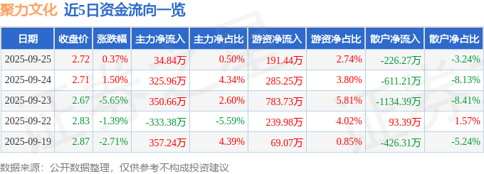 证券之星消息,截至2025年9月25日收盘,聚力文化(002247)报收于2.72元,上涨0.37%,换手率3.95%,成交量25.43万手,成交额6976.34万元。