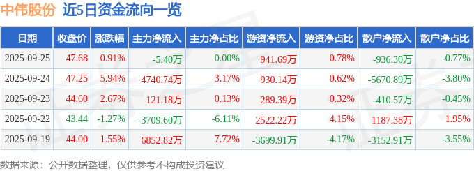 证券之星消息,截至2025年9月25日收盘,中伟股份(300919)报收于47.68元,上涨0.91%,换手率2.81%,成交量25.62万手,成交额12.1亿元。