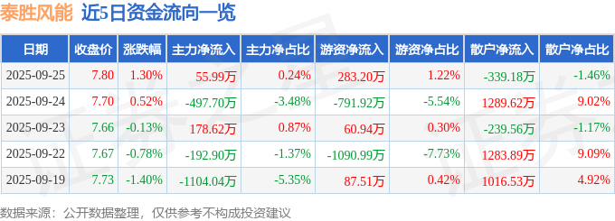证券之星消息,截至2025年9月25日收盘,泰胜风能(300129)报收于7.8元,上涨1.3%,换手率4.62%,成交量29.89万手,成交额2.33亿元。
