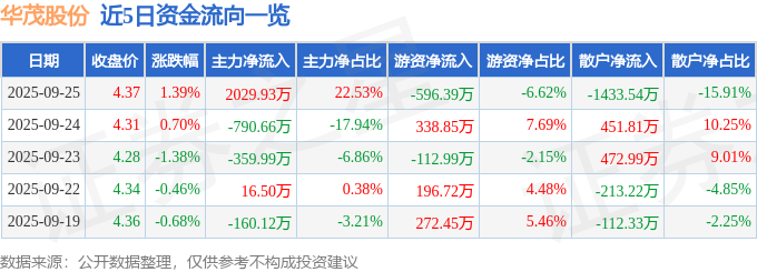 证券之星消息,截至2025年9月25日收盘,华茂股份(000850)报收于4.37元,上涨1.39%,换手率2.19%,成交量20.66万手,成交额9011.19万元。