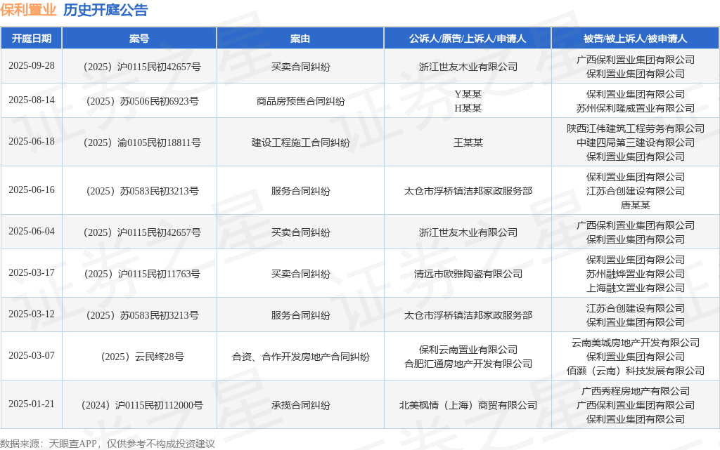 案号:(2025)沪0115民初42657号根据统计,近一年内以保利置业集团有限公司为当事人的历史开庭公告有9则,其中案由为“买卖合同纠纷”的公告以3则居首,其次为“服务合同纠纷”有2则,“合资、合作开发房地产合同纠纷”有1则。历史开庭公告如下: