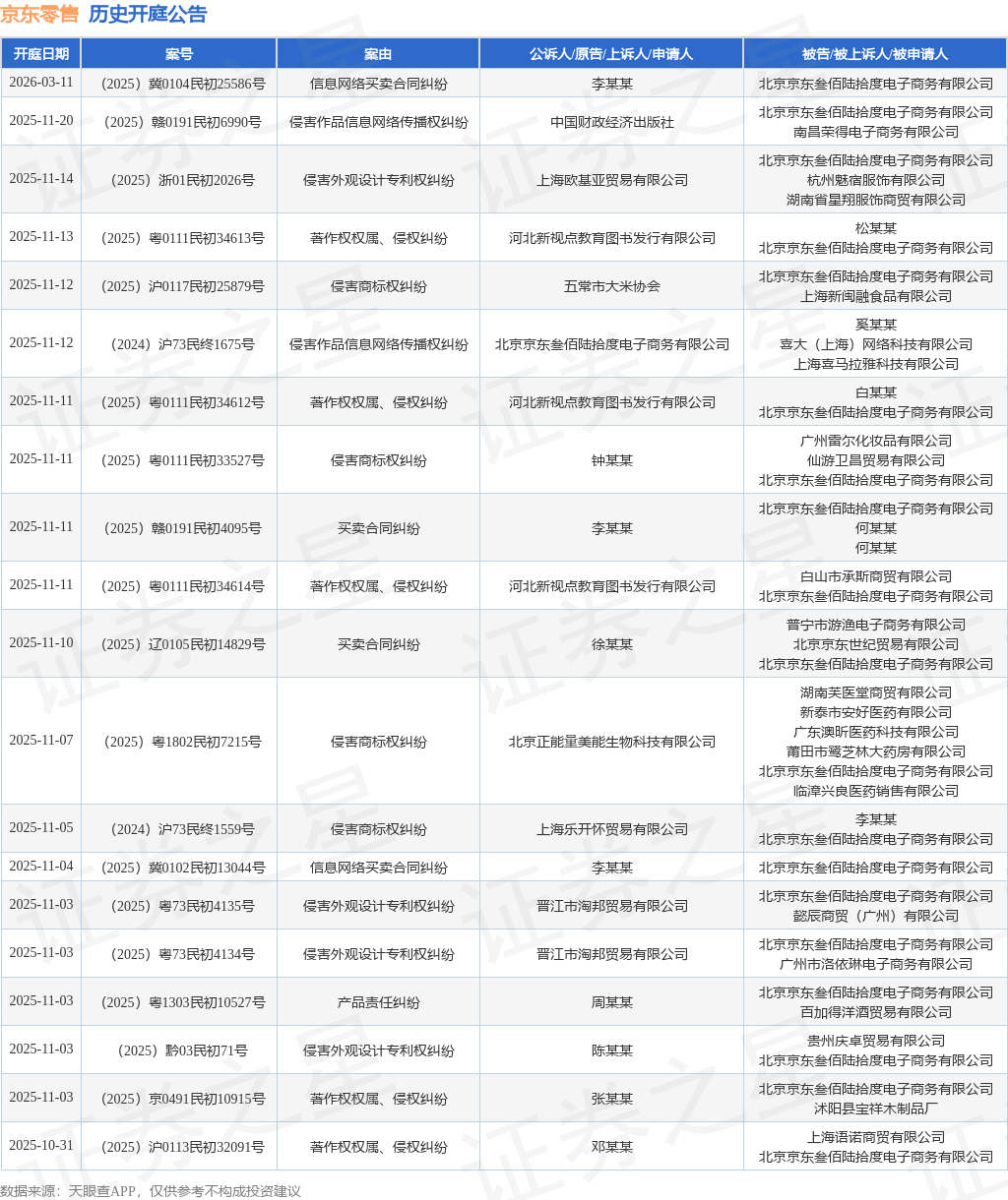 案号:(2025)沪0151民初7271号根据统计,近一年内以北京京东叁佰陆拾度电子商务有限公司为当事人的历史开庭公告有1560则,其中案由为“侵害商标权纠纷”的公告以431则居首,其次为“信息网络买卖合同纠纷”有287则,“著作权权属、侵权纠纷”有168则。历史开庭公告(前20条)如下: