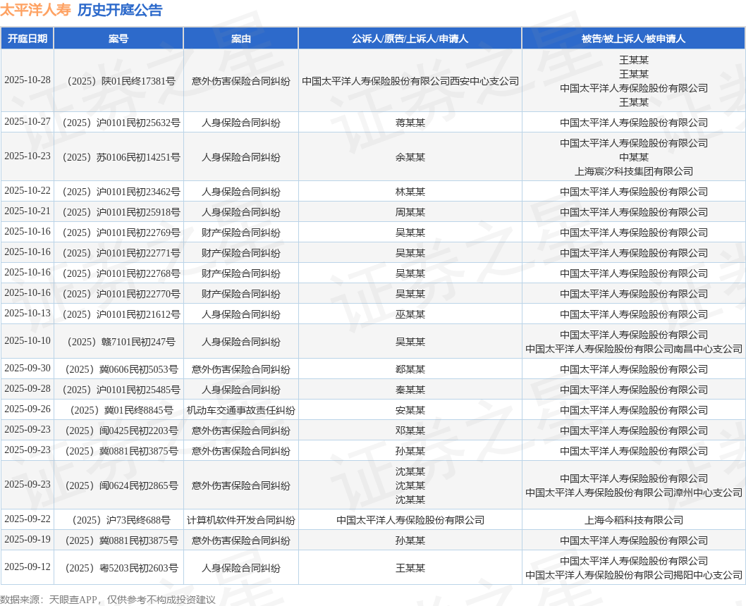 案号:(2025)沪0101民初25485号根据统计,近一年内以中国太平洋人寿保险股份有限公司为当事人的历史开庭公告有163则,其中案由为“人身保险合同纠纷”的公告以104则居首,其次为“意外伤害保险合同纠纷”有16则,“保险纠纷”有14则。历史开庭公告(前20条)如下: