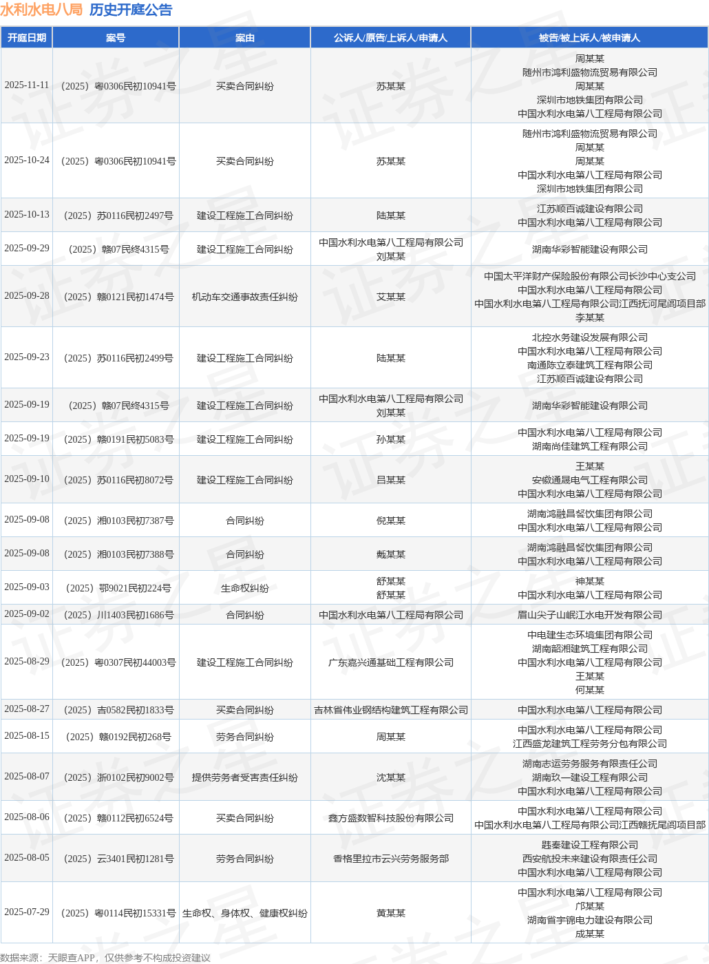 案号:(2025)赣0121民初1474号根据统计,近一年内以中国水利水电第八工程局有限公司为当事人的历史开庭公告有125则,其中案由为“建设工程施工合同纠纷”的公告以35则居首,其次为“劳务合同纠纷”有18则,“买卖合同纠纷”有14则。历史开庭公告(前20条)如下: