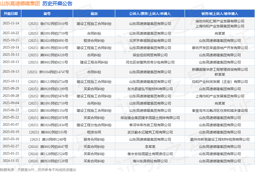 案号:(2025)冀0202民初3476号根据统计,近一年内以山东高速德建集团有限公司为当事人的历史开庭公告有19则,其中案由为“买卖合同纠纷”的公告以5则居首,其次为“建设工程施工合同纠纷”有5则,“合同纠纷”有4则。历史开庭公告如下: