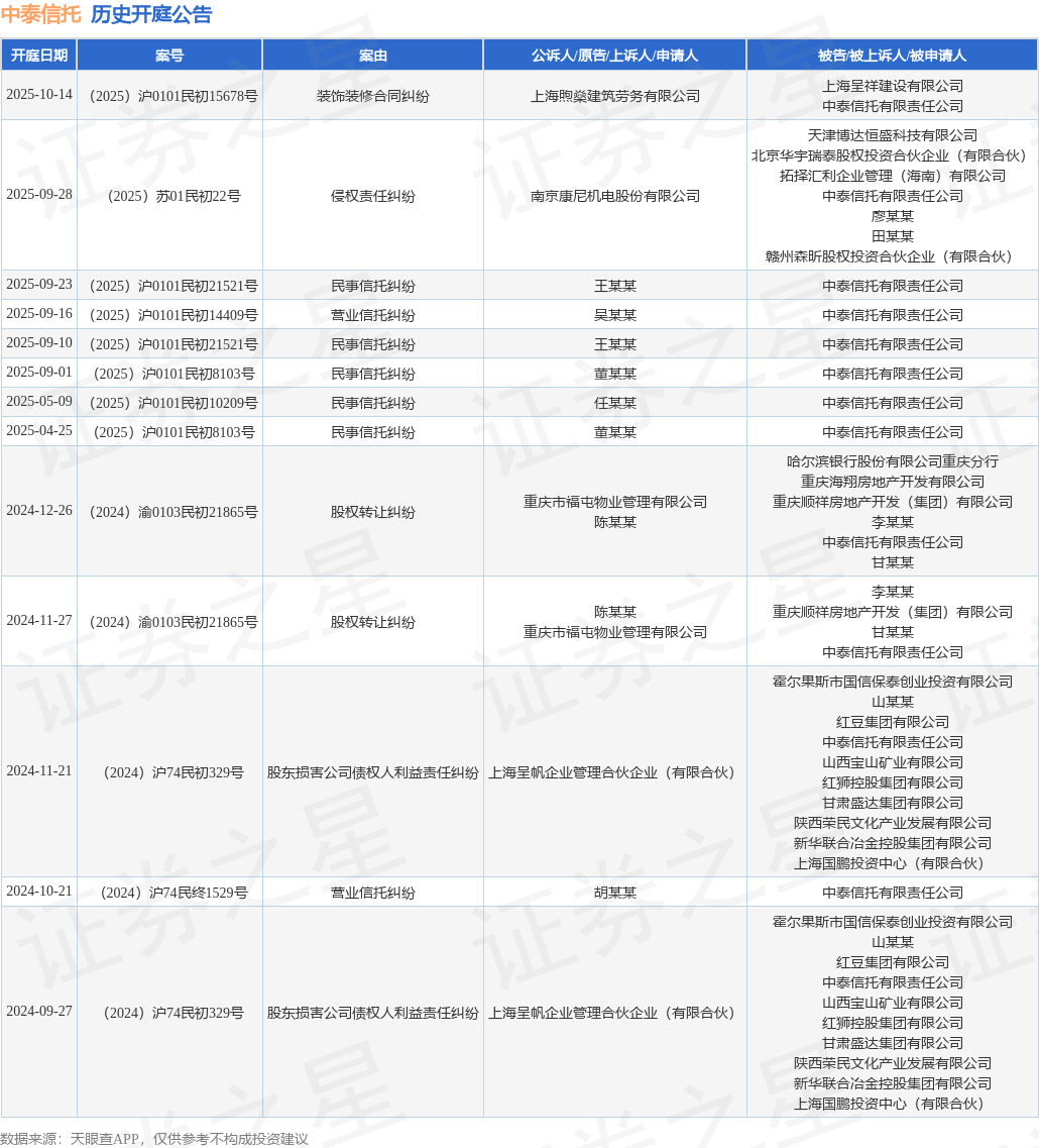 证券之星消息,根据天眼查APP显示,近日公布了一则中泰信托有限责任公司作为被告/被上诉人的开庭公告,详细内容如下: