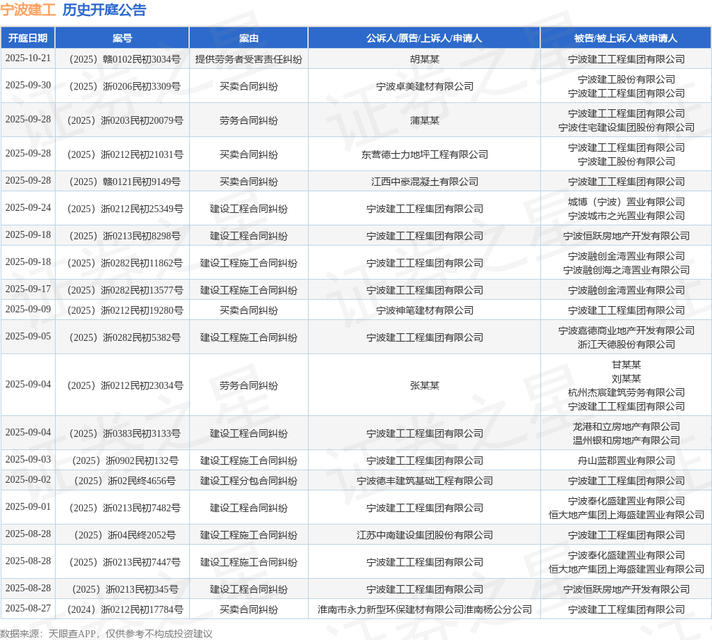 案号:(2025)浙0203民初20079号根据统计,近一年内以宁波建工工程集团有限公司为当事人的历史开庭公告有125则,其中案由为“买卖合同纠纷”的公告以36则居首,其次为“建设工程施工合同纠纷”有23则,“建设工程合同纠纷”有18则。历史开庭公告(前20条)如下:
