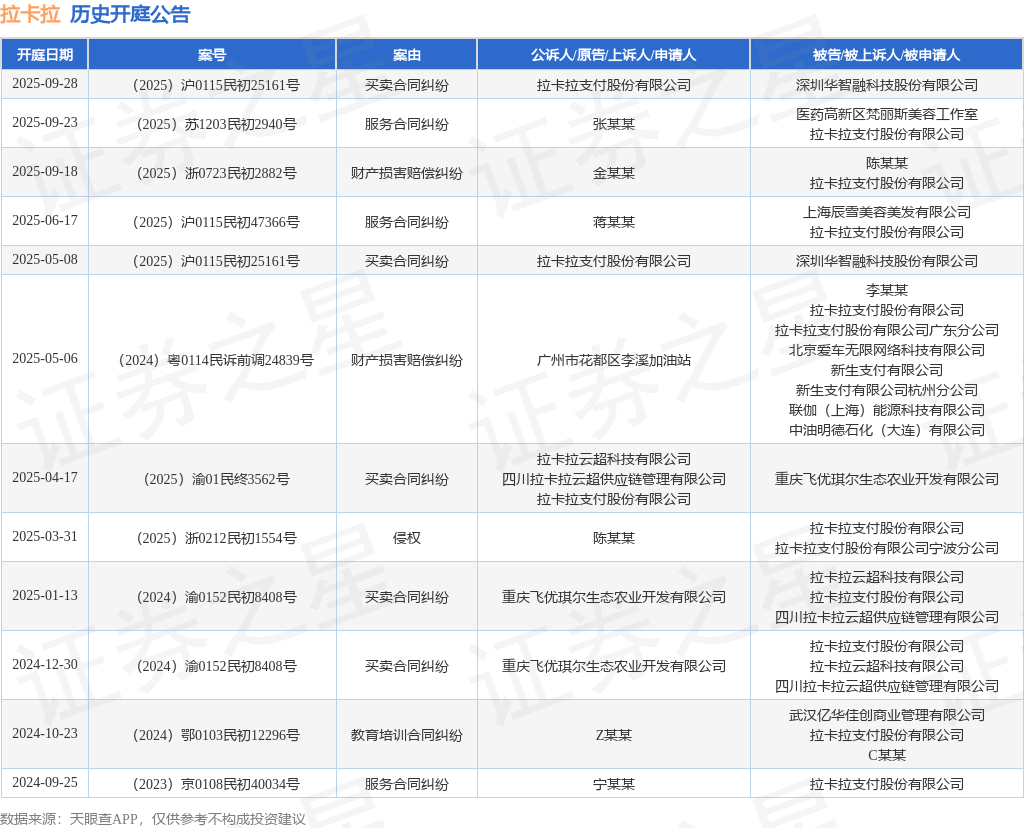 案号:(2025)沪0115民初25161号根据统计,近一年内以拉卡拉支付股份有限公司为当事人的历史开庭公告有12则,其中案由为“买卖合同纠纷”的公告以5则居首,其次为“服务合同纠纷”有3则,“财产损害赔偿纠纷”有2则。历史开庭公告如下: