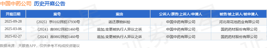 证券之星消息,根据天眼查APP显示,近日公布了一则中国中药有限公司作为原告/上诉人的开庭公告,详细内容如下: