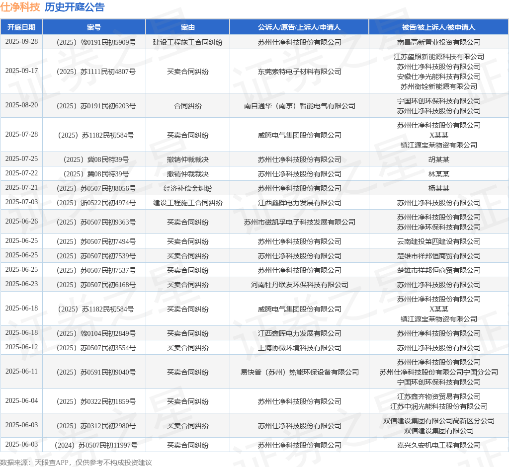 案号:(2025)赣0191民初5909号根据统计,近一年内以苏州仕净科技股份有限公司为当事人的历史开庭公告有57则,其中案由为“买卖合同纠纷”的公告以28则居首,其次为“分期付款买卖合同纠纷”有6则,“合同纠纷”有6则。历史开庭公告(前20条)如下: