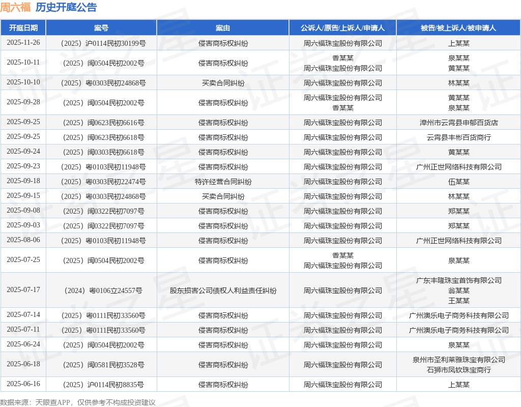 案号:(2025)闽0504民初2002号根据统计,近一年内以周六福珠宝股份有限公司为当事人的历史开庭公告有46则,其中案由为“侵害商标权纠纷”的公告以32则居首,其次为“合同纠纷”有3则,“商标行政纠纷”有3则。历史开庭公告(前20条)如下:
