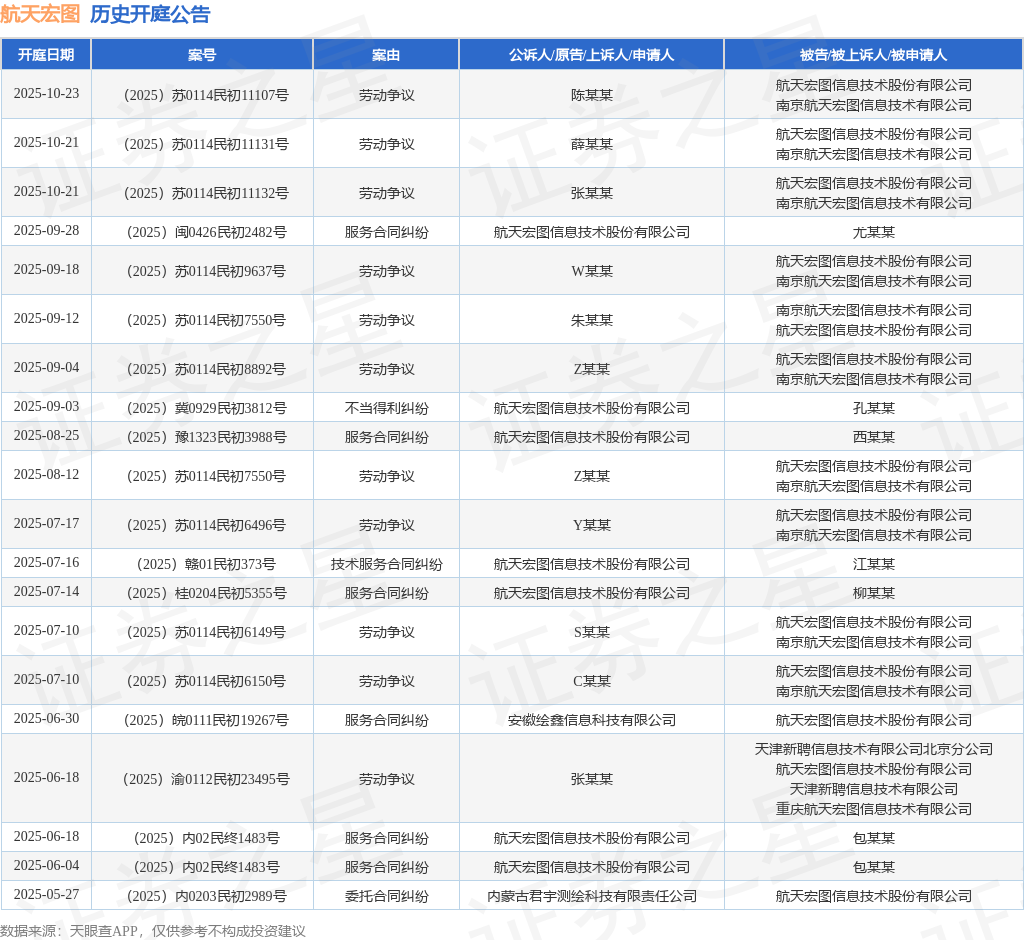 案号:(2025)闽0426民初2482号根据统计,近一年内以航天宏图信息技术股份有限公司为当事人的历史开庭公告有28则,其中案由为“劳动争议”的公告以11则居首,其次为“服务合同纠纷”有11则,“买卖合同纠纷”有2则。历史开庭公告(前20条)如下: