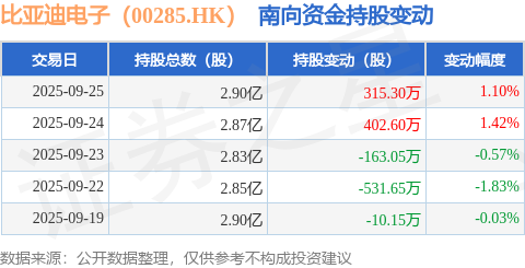 证券之星消息,9月25日南向资金增持315.3万股比亚迪电子(00285.HK)。近5个交易日中,获南向资金增持的有2天,累计净增持13.05万股。近20个交易日中,获南向资金增持的有7天,累计净增持1819.22万股。截至目前,南向资金持有比亚迪电子(00285.HK)2.9亿股,占公司已发行普通股的12.87%。