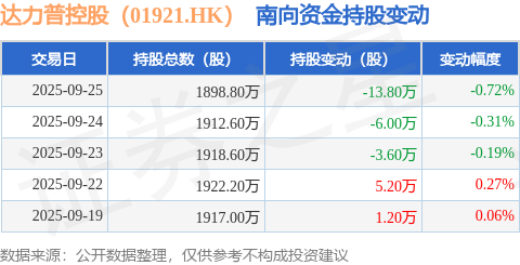 证券之星消息,9月25日南向资金减持13.8万股达力普控股(01921.HK)。近5个交易日中,获南向资金减持的有3天,累计净减持17.0万股。近20个交易日中,获南向资金减持的有14天,累计净减持101.8万股。截至目前,南向资金持有达力普控股(01921.HK)1898.8万股,占公司已发行普通股的1.25%。