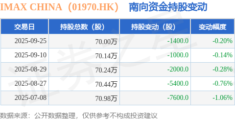 证券之星消息,9月25日南向资金减持1400.0股IMAX CHINA(01970.HK)。近5个交易日中,获南向资金减持的有5天,累计净减持1.74万股。近20个交易日中,获南向资金减持的有20天,累计净减持17.02万股。截至目前,南向资金持有IMAX CHINA(01970.HK)70.0万股,占公司已发行普通股的0.2%。